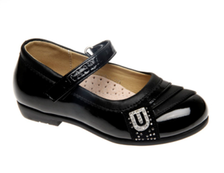| Красивые туфли черного цвета для девочек. Универсальная обувь, незаменимая вещь в гардеробе маленькой модницы. Будут смотреться идеально и со школьной формой, и с нарядным платьем. Туфли изготовлены из комбинированной кожи с блестящим лаковым мыском и декорированы сверкающими камушками. Они, несомненно, приведут в восторг маленькую модницу. |
