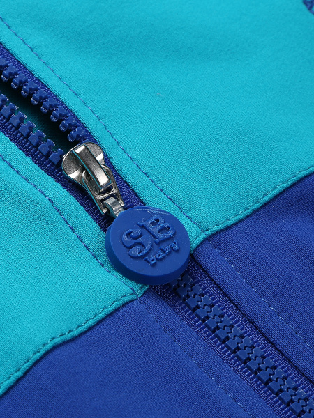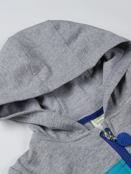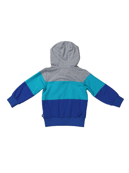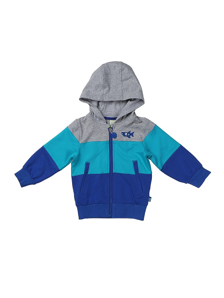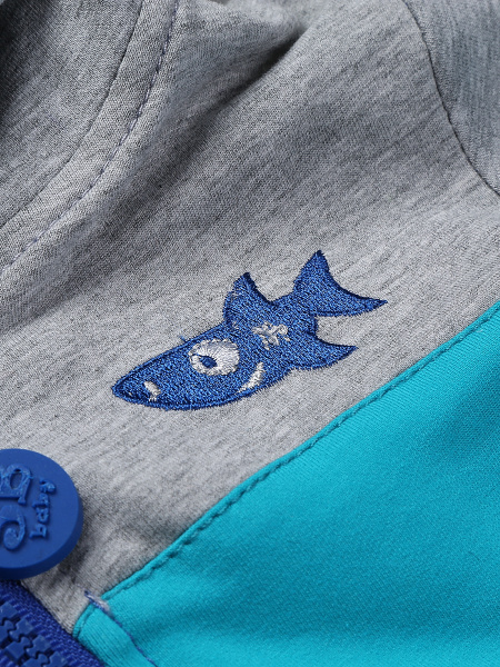 | Трехцветная модная толстовка с капюшоном - весьма практичная вещь на каждый день. Курточка застегивается на крупную молнию с удобным пластиковым замком, дополняется боковыми врезными карманами. Для хорошей посадки рукава и нижний край изделия обрамлены эластичными манжетами. Для оформления используется два различных оттенка: синий и светло-серый. Мальчишкам понравится мелкая вышивка в виде доброй веселой акулы. |