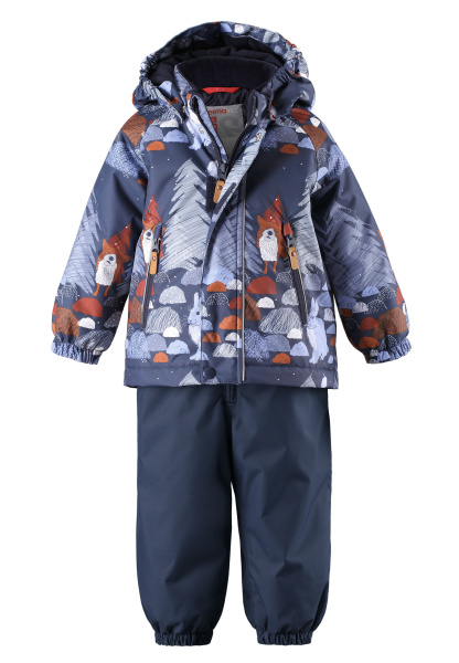 | Отличная зимний костюм для малышей: куртка и классический полукомбинезон Reima. Основные швы проклеены, куртка и брюки изготовлены из водо- и ветронепроницаемого, грязеотталкивающего материала. |