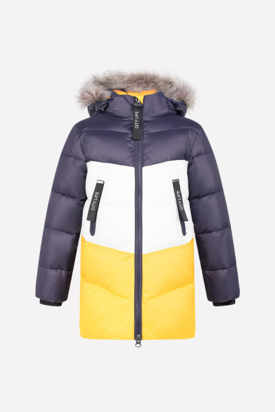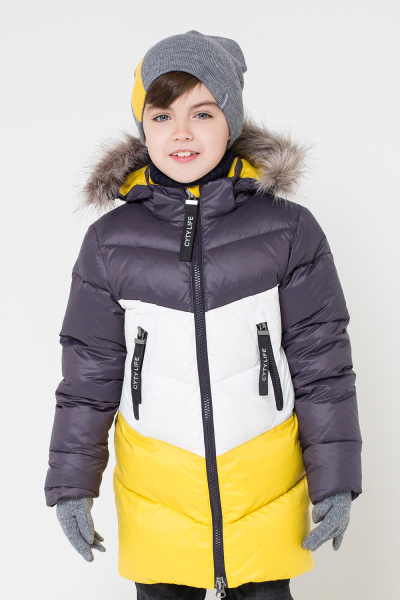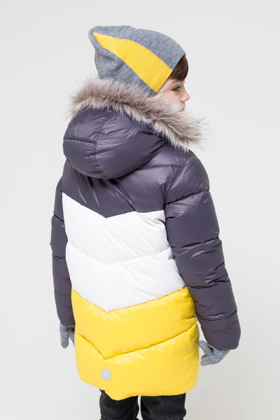 Пуховик из ветронепроницаемого материала с тефлоновым покрытием, очень теплый и качественный. Удачное сочетание цветов: графитового, белого и желтого, делает его стильным и модным.